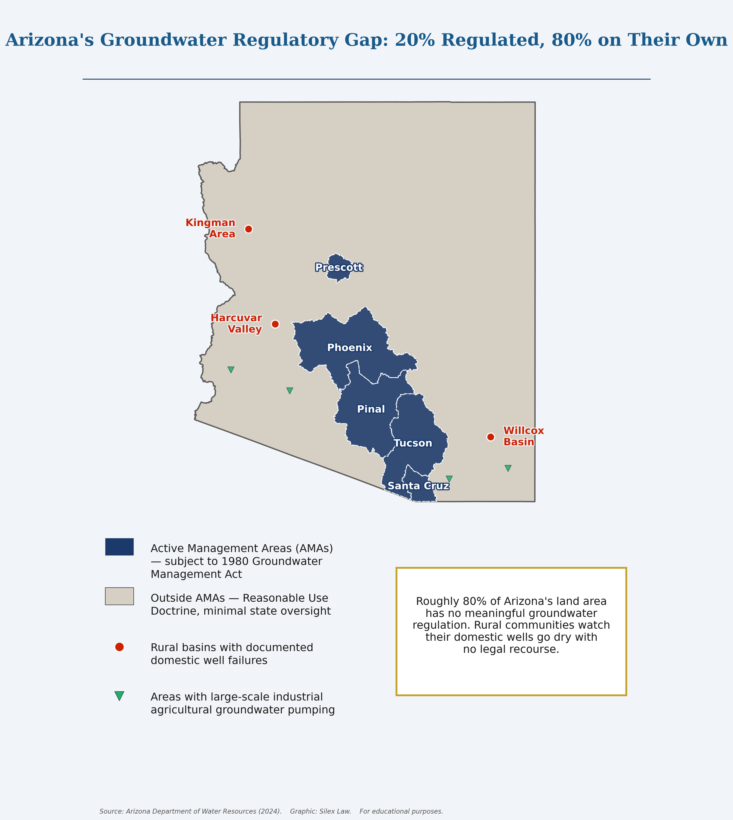 Arizona's five Active Management Areas — Phoenix, Tucson, Prescott, Pinal, and Santa Cruz — cover roughly 20% of the state's land area and are subject to the 1980 Groundwater Management Act. The remaining 80% operates under the Reasonable Use Doctrine, with minimal state oversight. Red markers indicate rural basins with documented domestic well failures. Source: Arizona Department of Water Resources (2024). Graphic: Silex Law. For educational purposes.