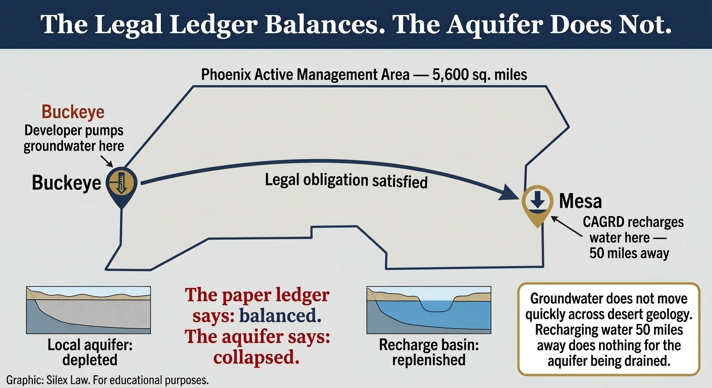 The flaw is geographic and it is foundational. An Active Management Area like Phoenix covers more than 5,600 square miles. A developer can build a subdivision on the far western edge of the AMA — in Buckeye, for instance — pump fossil groundwater from beneath that community, and satisfy the legal replenishment obligation by depositing Colorado River water into a recharge basin fifty miles away in the East Valley. The paper ledger balances. The aquifer beneath Buckeye does not recover. Groundwater does not move quickly across dozens of miles of desert geology. Recharging water in one part of a massive basin does nothing to replace the water being physically drained from another part.