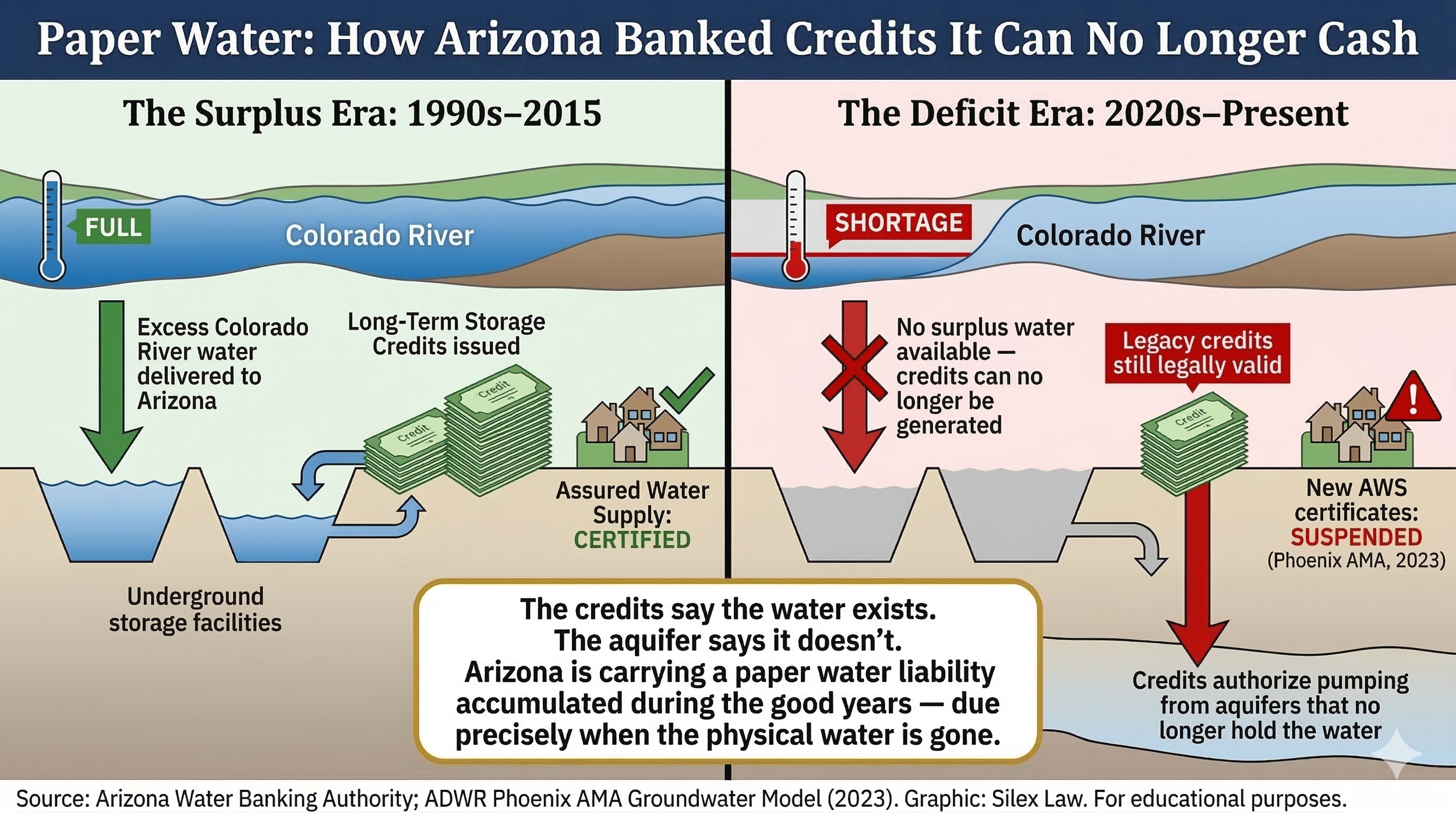 During the surplus era, Arizona banked Long-Term Storage Credits by recharging excess Colorado River water into underground storage facilities. In the deficit era, no surplus water is available to generate new credits — but legacy credits remain legally valid and continue to authorize pumping from aquifers that no longer hold the water. New Assured Water Supply certificates in the Phoenix AMA were suspended in 2023. Source: Arizona Water Banking Authority; ADWR Phoenix AMA Groundwater Model (2023). Graphic: Silex Law. For educational purposes.