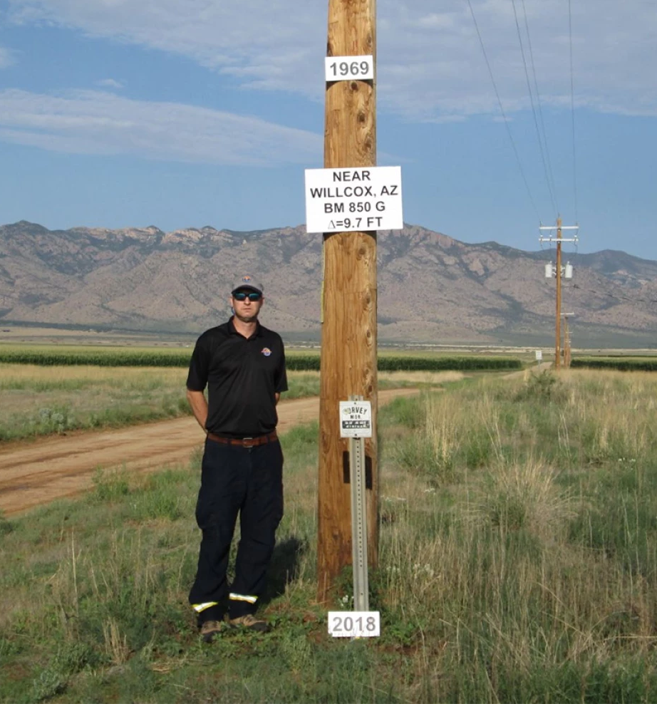 Benchmark BM 850 G near Willcox, Arizona. The 1969 marker at the top of the pole records the original ground surface. By 2018, the land had sunk 9.7 feet — driven by decades of agricultural groundwater pumping that exceeds the aquifer's natural recharge rate. The Willcox Basin has recorded the highest annual subsidence rates in Arizona. Source: Brian Conway / Arizona Department of Water Resources. For educational purposes.