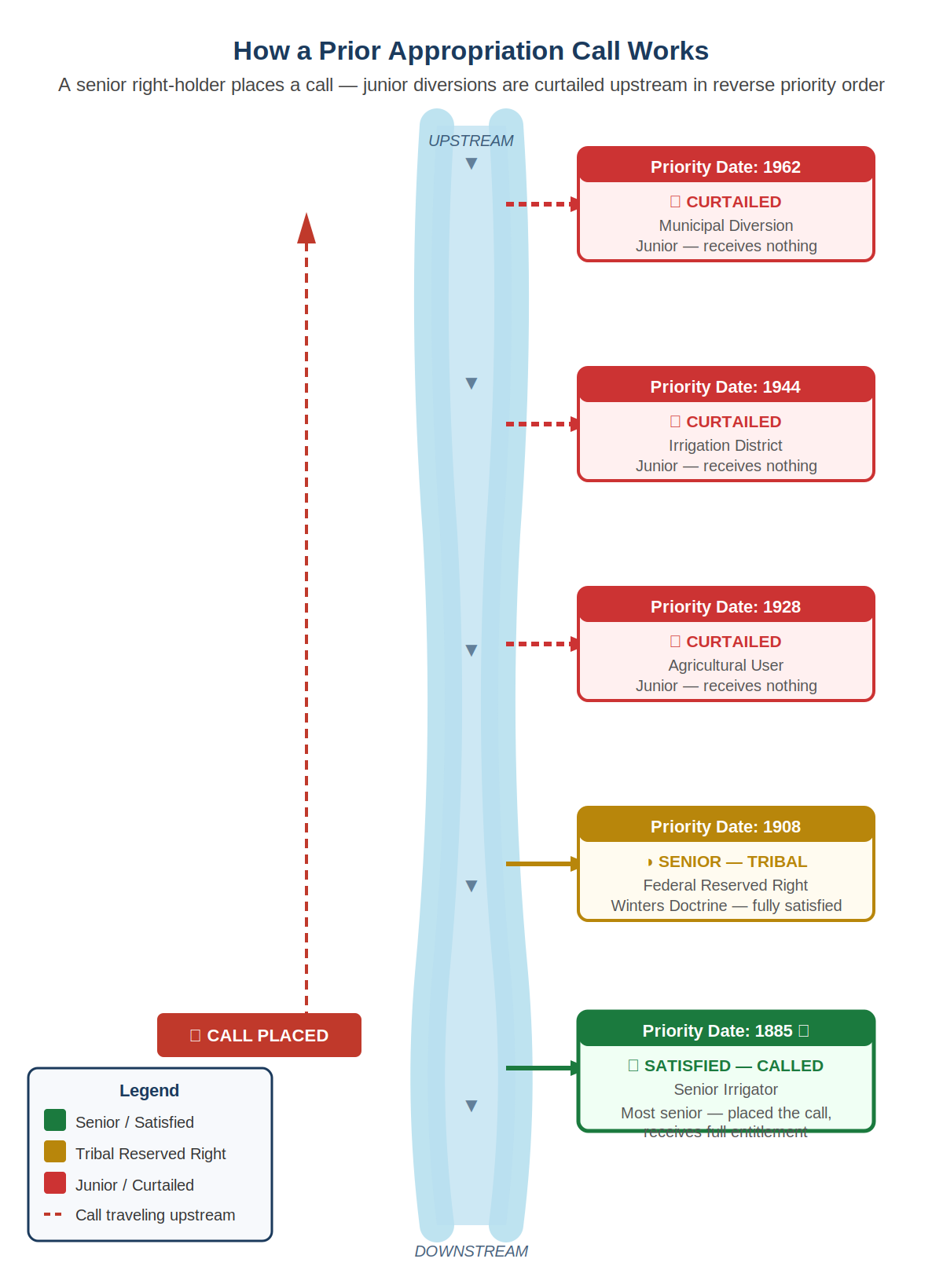 How a Prior Appropriation Call Works. When a senior right-holder places a call, the water administrator curtails junior diversions upstream in reverse priority order until the senior right is satisfied. Under the Winters Doctrine, tribal reserved rights carry priority dates from the reservation establishment, preceding most other rights on a river system.