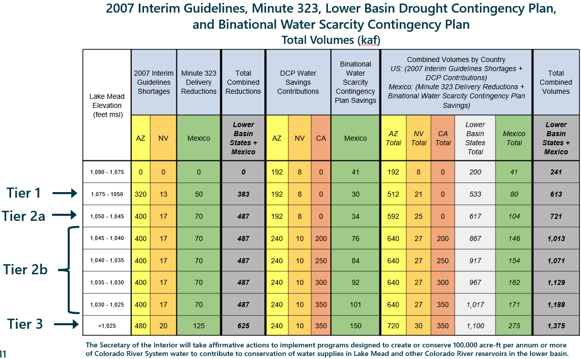 Shortage tiers, delivery reductions, and conservation contributions under the 2007 Interim Guidelines, Minute 323, Lower Basin Drought Contingency Plan, and Binational Water Scarcity Contingency Plan, by Lake Mead elevation (figures in thousand acre-feet). California bears no mandatory shortage obligation under the 2007 Interim Guidelines; Arizona absorbs the largest share at every tier. These tiers govern operations through 2026 and will be superseded by post-2026 operational guidelines currently under federal rulemaking. Source: U.S. Bureau of Reclamation / U.S. Department of the Interior (public domain).
