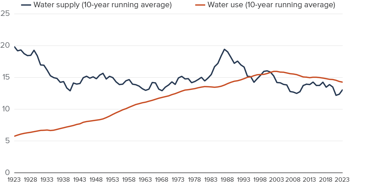 Water supply and use in the Colorado River Basin, 1923–2023 (10-year running averages). Despite significant demand management efforts since 2000, use continues to exceed available supply. Source: Public Policy Institute of California, adapted from USBR Colorado River Basin Water Supply and Demand Study (2012) with updated USBR historical data. Supply estimates for 2021–23 are provisional.