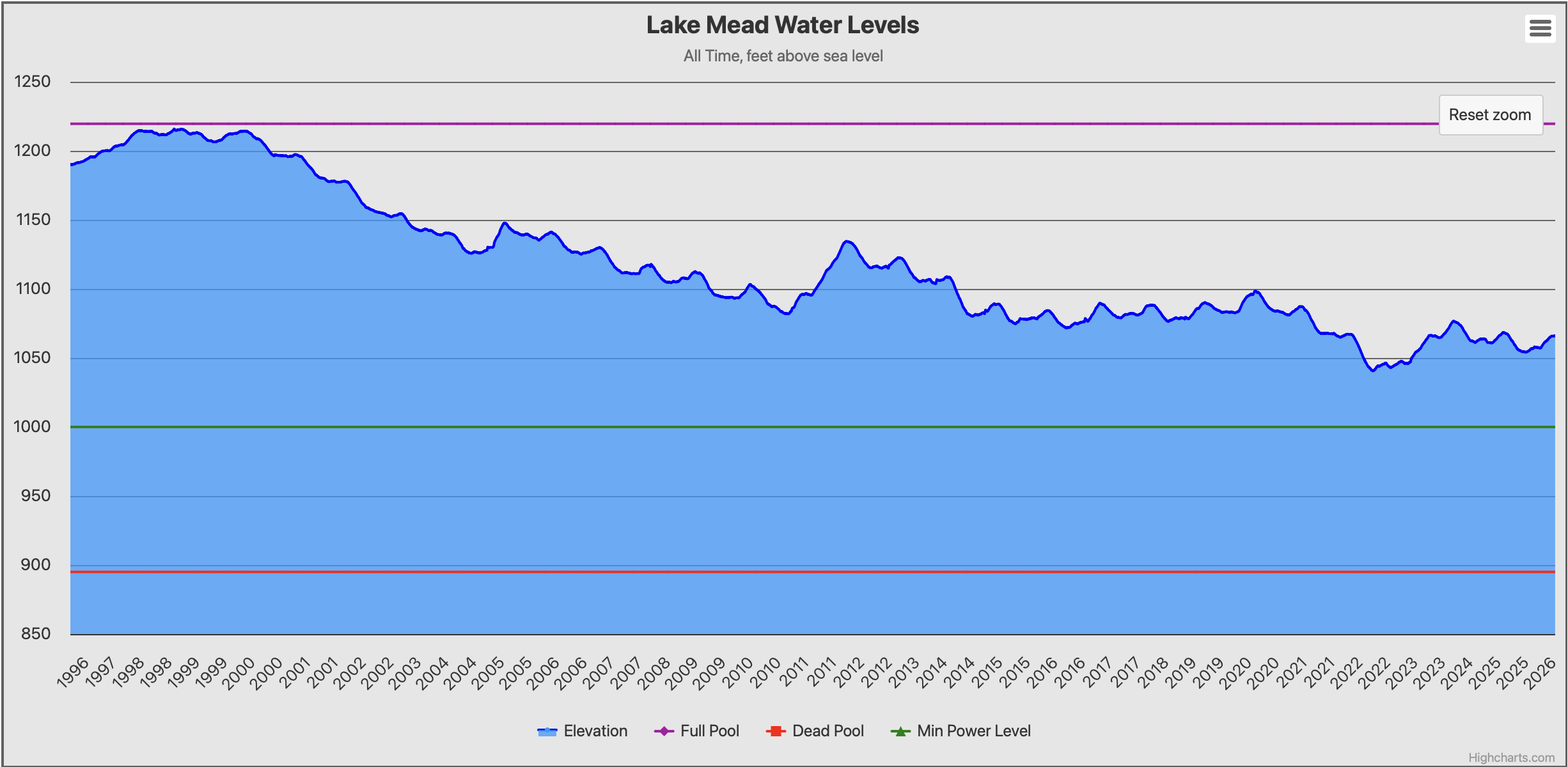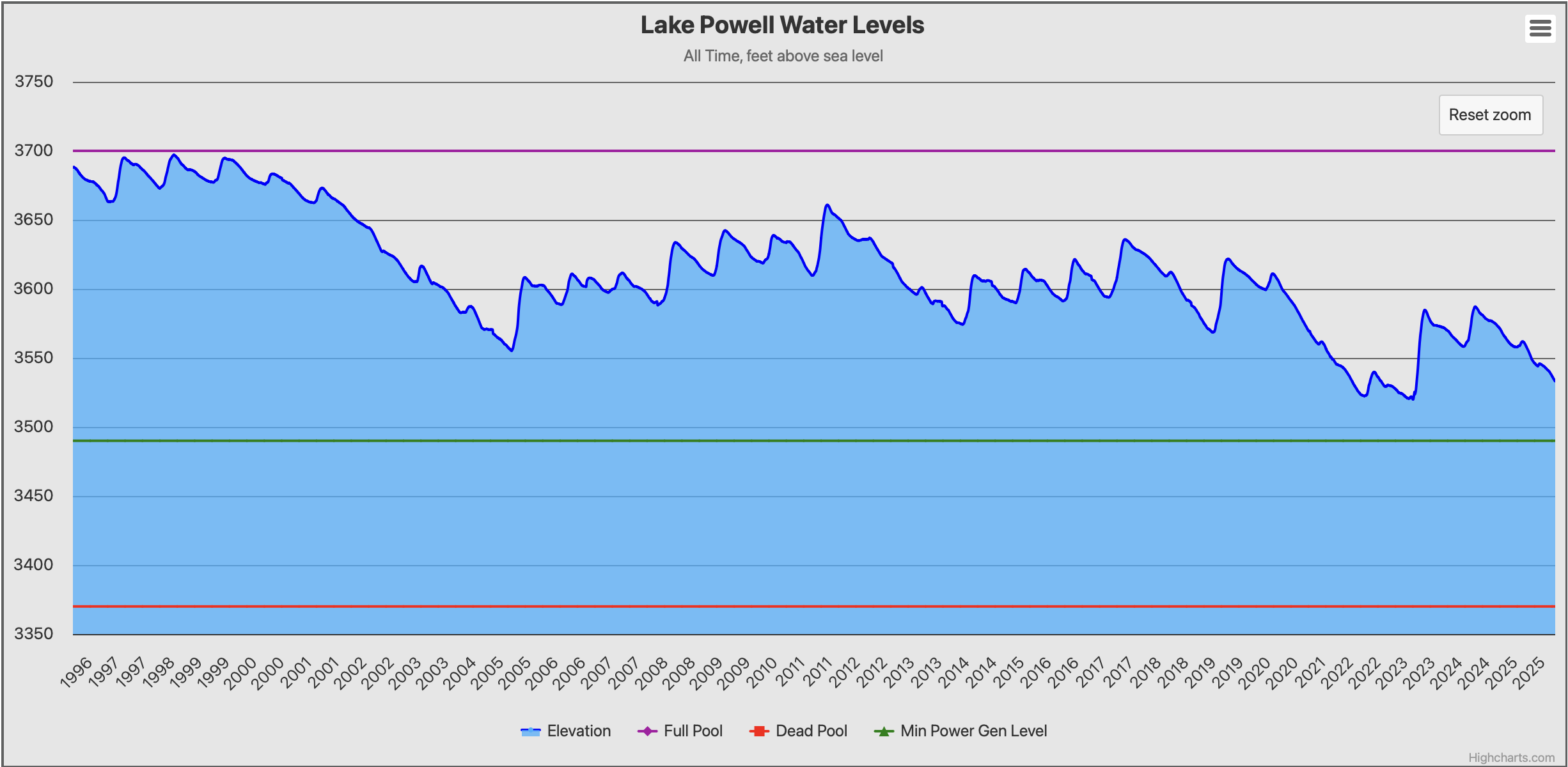 Lake Powell and Lake Mead daily water surface elevation, 1996-present. Reference lines indicate Full Pool, Minimum Power Generation level, and Dead Pool. Source: water-data.com (graphs.water-data.com), data courtesy U.S. Bureau of Reclamation. Underlying USBR elevation data is in the public domain.